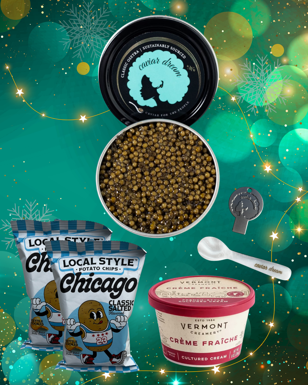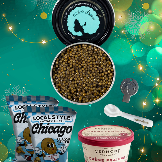 Gift them a Classic Osetra moment that feels personal, thoughtful, and effortlessly chic. This set includes a 1 oz. tin of our signature Classic O, Chicago-based "Local Style" Classic Sea Salt chips, silky crème fraîche, and our equally iconic branded accessory duo: a mother-of-pearl spoon and a specially designed caviar key. It's the easiest way to elevate any caviar lover's palate...and make their whole holiday taste better.
